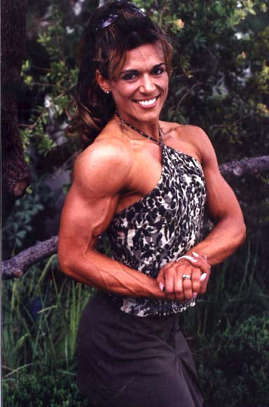 Angie was yet another fitness/figure woman with a high level of lean muscle, and she was strong also, from years as nationally ranked gymnast. We had two sessions with her in 2003- in lean contest shape at about 5'4" 120 pounds, then 'off-season' at about 135. We did gymwork with her at the heavier weight- she did a combination workout featuring repwork, then several bodyweight reps in the bench, and easy handstand pushups NOT against a wall! Lots of posing in many outfits for both tapings with emphasis on her more muscular upper body poses. Her interview also included. This was our only session with her, but she went on to have a great career as an IFBB fitness pro under the name Angela Monteleone. Video running time about 2 hours.