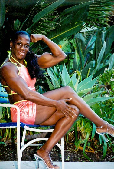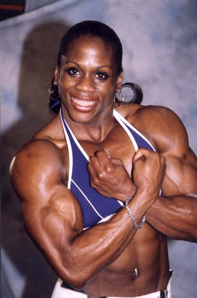 We cant be sure if Sheilahe had the largest biceps in the history of the sport, but it sure looked like it. At 5'7" 150+ pounds, she was in top contest shape when freelance videographer, Tony Duffy, did this work with her in 2003. She did have some high placements in national shows, but we are surprised she did not go further, as she certainly had 'the look' that the judges wanted- a tall, balanced physique, but with terrific size and hardness, topped off by a beautiful face. Her 16+" arms (and incredible back) helped her do 20 easy chins, and that was followed by more repwork in the gym, then posing in bikini and dresses. Despite her height, she was a former ballerina, which can in part explain her tremendous lower body development. An interview also included. Video running time about 100 minutes.
