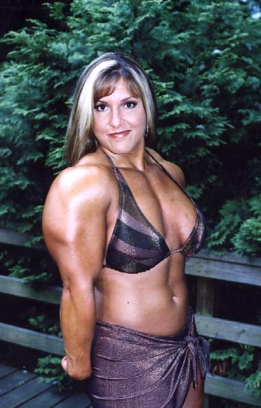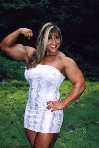 We met Gina at the 2003 Nationals when we did work with her in contest shape. We had seen some photos of her in her “huge off season shape” and directed her to come to our next photo/video session as big as she could be, which turned out to be one of the largest women height (5’5”) per weight (190+) ever. This was a TRUE off-season shooting – she was not very defined, but that was not the idea, instead, she shows off huge 17” arms and 28” thighs in a variety of posing outfits and in the gym, where she did some very strong lifts, including one arm chins and easy 1100 pound leg presses for 20 reps. Racking the lat pull down machine and very heavy incline benching was not too shabby either…Gina hits the shots in a two piece (bikini top, very short bottom) and three other dresses in perfect outdoor lighting, and is interviewed. Tape/DVD runs 100 minutes.