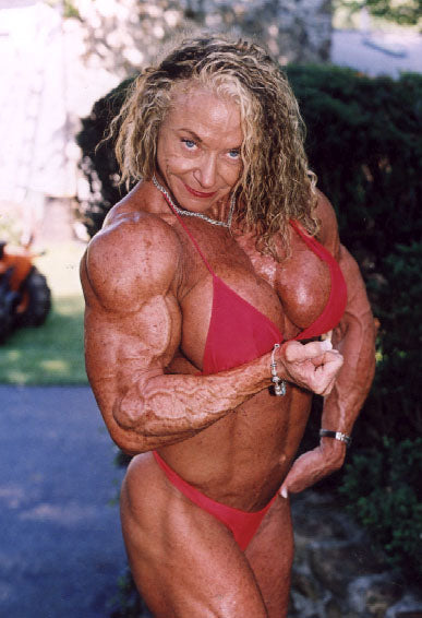 This was our third full photo/video session with the mighty Trudy, who always shows up ripped and very vascular no matter what her weight. For this session she was in top contest shape (5'4" 155 or so pounds) as she had just competed in the 2006 Teen, Collegiate and Masters Nationals, and her condition was right on and very impressive, particularly since she is turning 50!! She is always incredible at chinning, and after that we do a rep workout while giving her chocolate, with the result being some of the most vascularity we have ever seen. As for many women, her upper body is the more impressive, featuring huge 16" arms as well as classic back, tricep and chest development- but, the lower body is nearly as good- well developed thighs and great calves- one of the most developed women of all time. Video/DVD runs 1 1/2 hours.